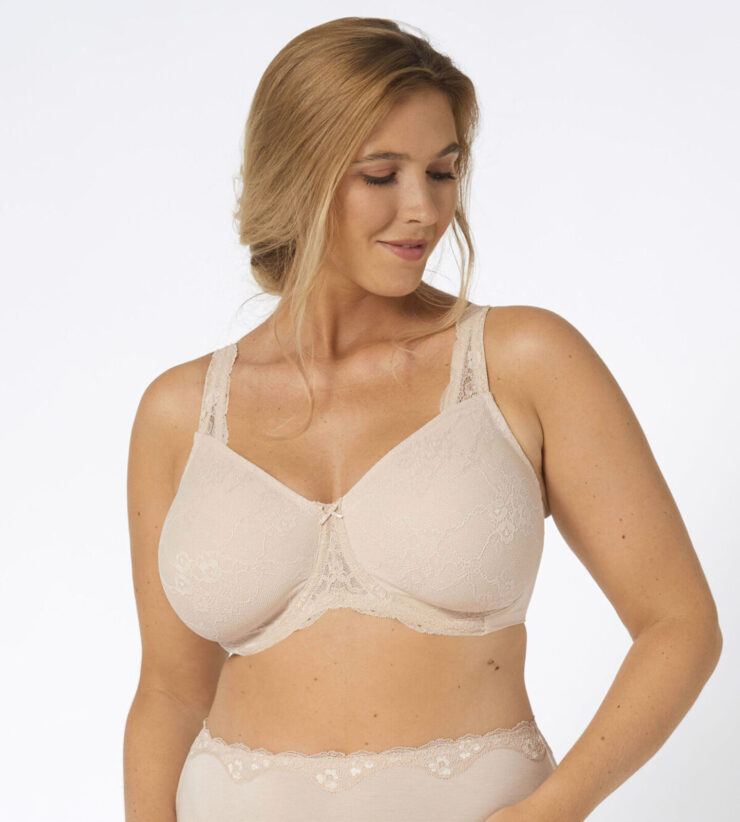 Mehke, neokrepljeni košarici na oporah iz ribje kosti lepo objemajo in držijo oprsje • S konstrukcijo Minimizer bo izgledalo Tvoje oprsje manjše tudi za eno celo velikostno številko košaric • Nežna, cvetlična čipka na košaricah in naramnicah poudari ženstvenost -Stranska in hrbtni del nedrčka so narejeni iz gladkih, mehkih mikrovlaken • Spodnje prožne utrjene obrobe 3D Flexi se odlično prilagajajo gibom telesa, zagotavljajo oporo oprsju in udobje pri nošenju • Okrasne, nastavljive naramnice zagotavljajo neverjetno udobje in prileganje.